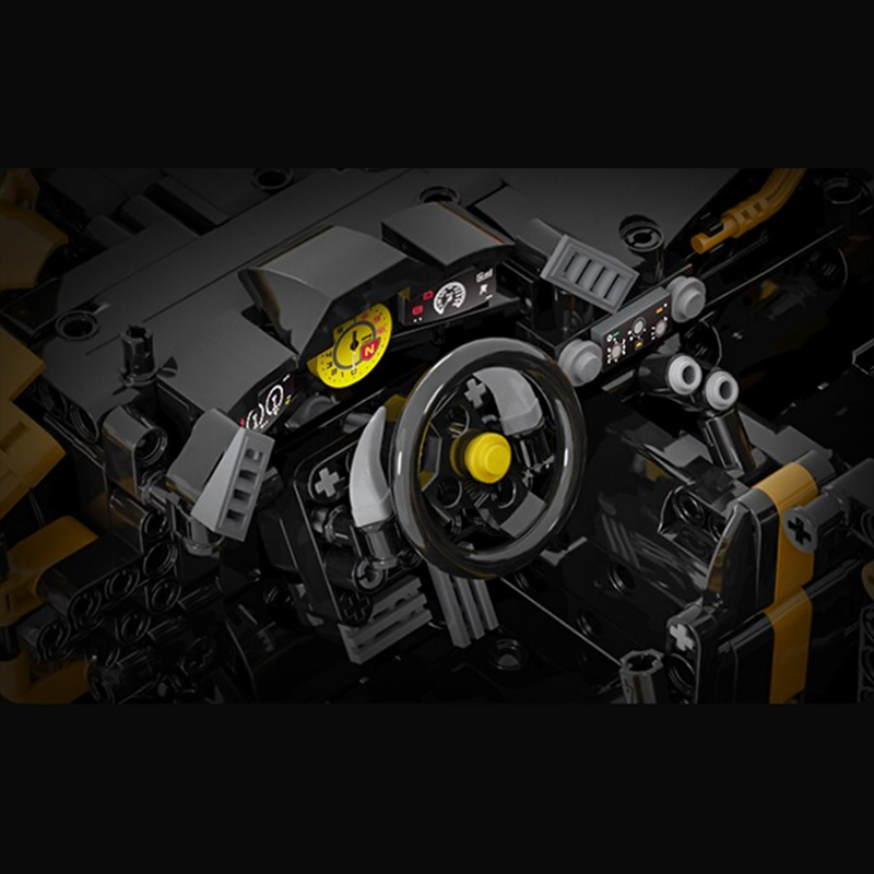 Tómate tu tiempo para apreciar los intrincados detalles de ensamblaje, incluyendo el compartimento del motor, la consola central, el volante, los espejos retrovisores izquierdo y derecho, los asientos dobles y la palanca de cambios. Cada componente está elaborado a la perfección.