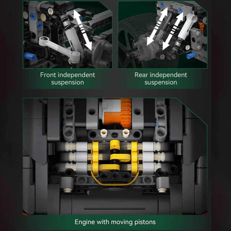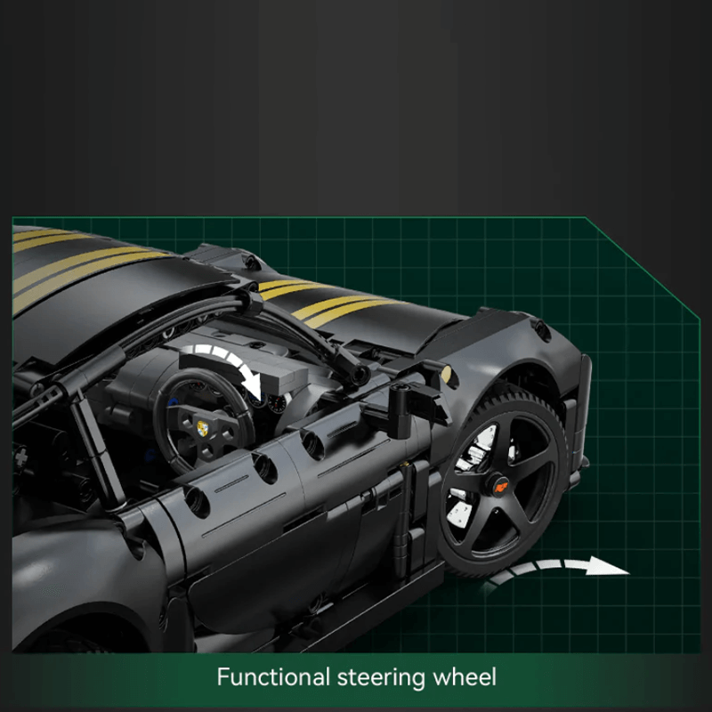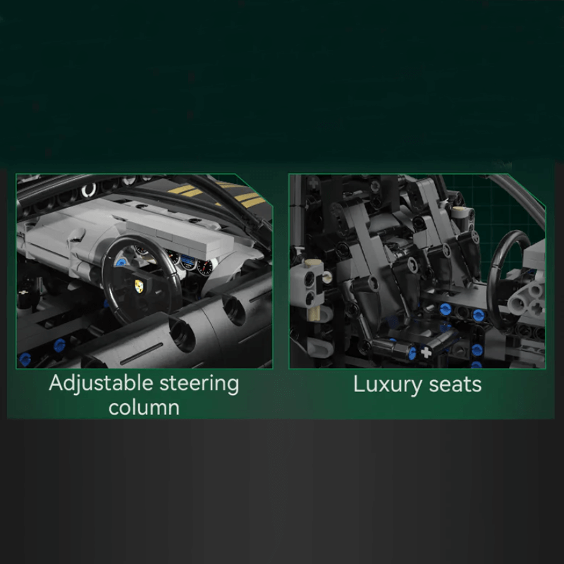 Au cœur de cette voiture se trouve un moteur boxer fonctionnel à six pistons rotatifs, relié de manière visible à une transmission complète. L'ouverture des portes, du capot et du compartiment moteur révèle un intérieur très détaillé, avec un volant fonctionnel, des disques de frein et un agencement réaliste de l'habitacle.