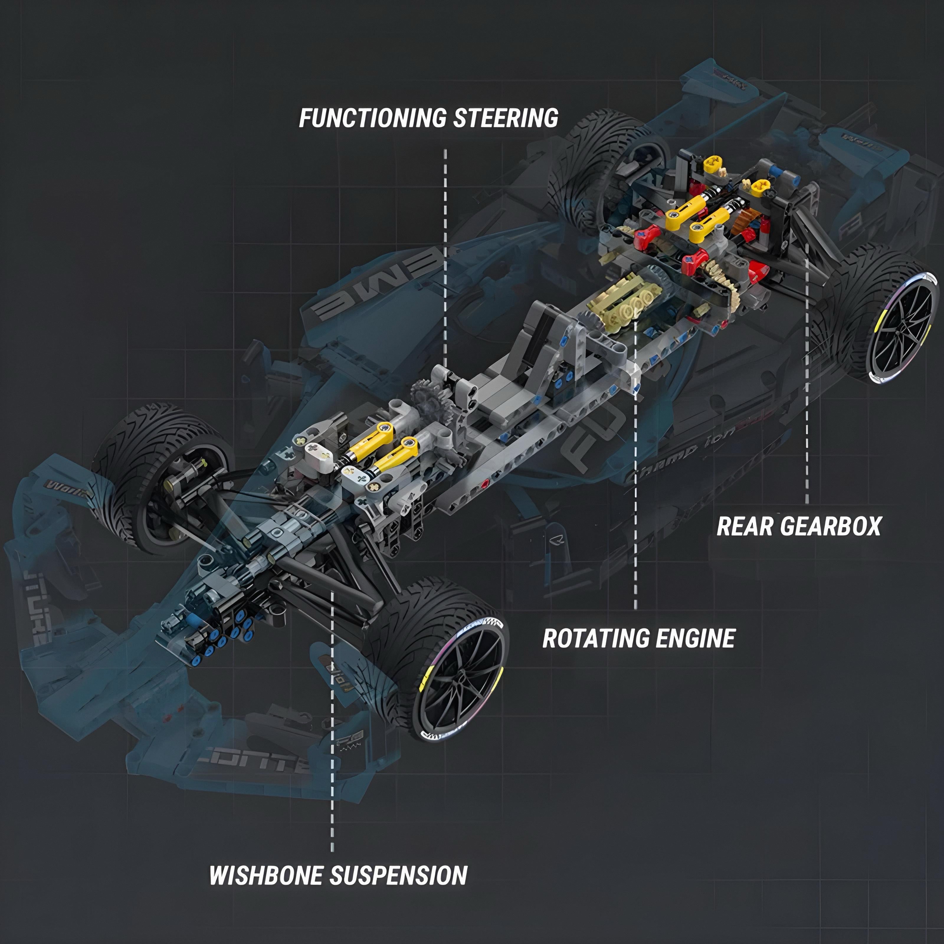 Underneath the aerodynamic shell lies a fully developed transmission system, independent front and rear wishbone suspension, and a V6 engine with rotating pistons, adding mechanical depth beyond pure display. Remote-controlled drive and steering put you in command, while the halo-style driver protection completes the authentic single-seater race cockpit.