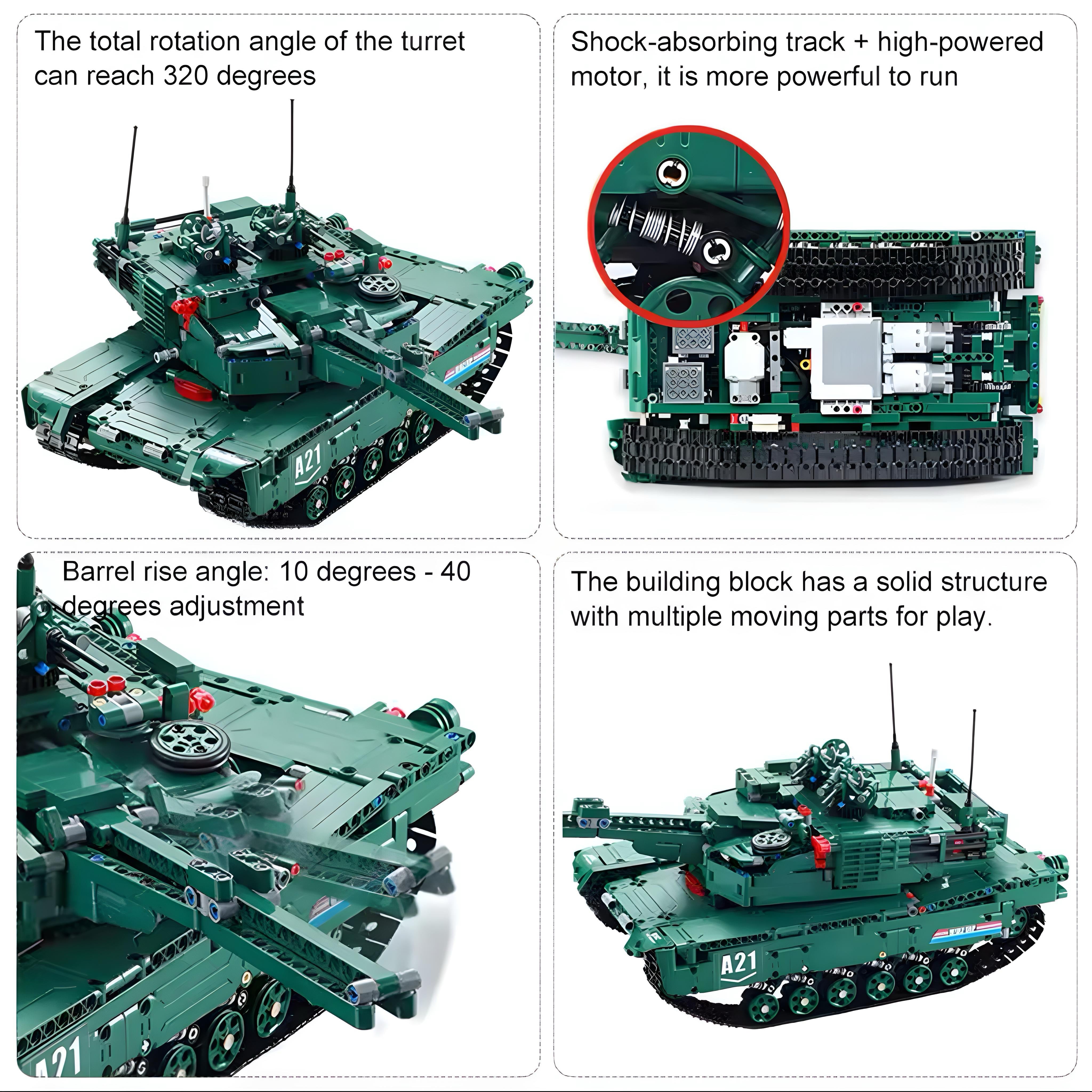 Constructed from over 1400 precision pieces, this model features fully remote-controlled drive, allowing the tank to manoeuvre smoothly across terrain using its dual-track system. A rotating turret, also controlled remotely, adds tactical realism and gives you full control over battlefield positioning.