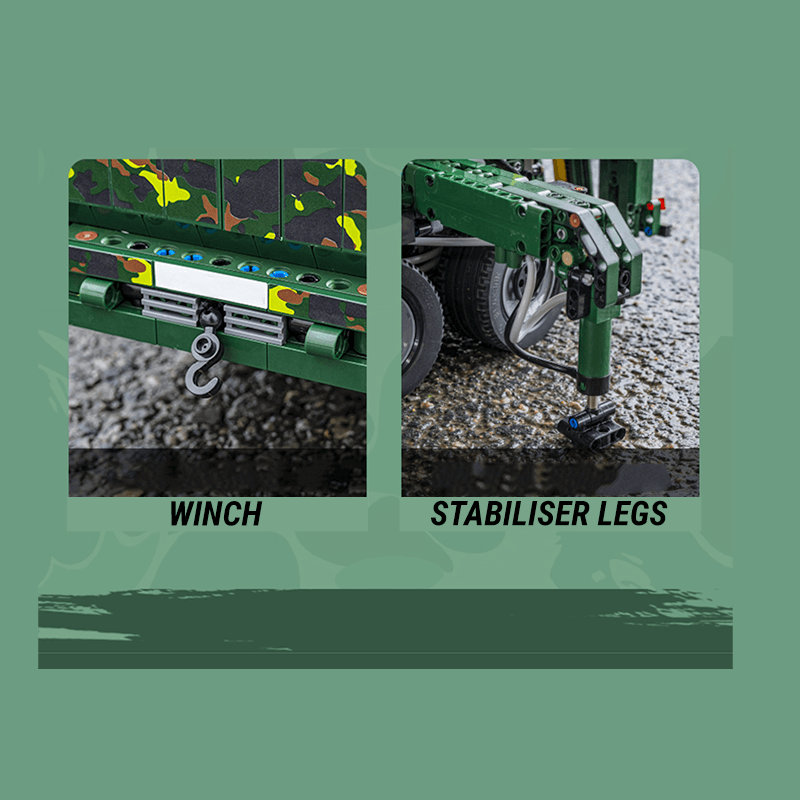Fully remote controlled drive and steering integrate seamlessly with advanced crane mechanics. The boom extends and retracts smoothly, while the crane hook raises and lowers with precision. The rotating crane arm and cabin allow 360-degree operational flexibility. Fully pneumatic stabiliser legs deploy and retract to anchor the vehicle during lifting operations, and the extending tow arm enhances recovery versatility.