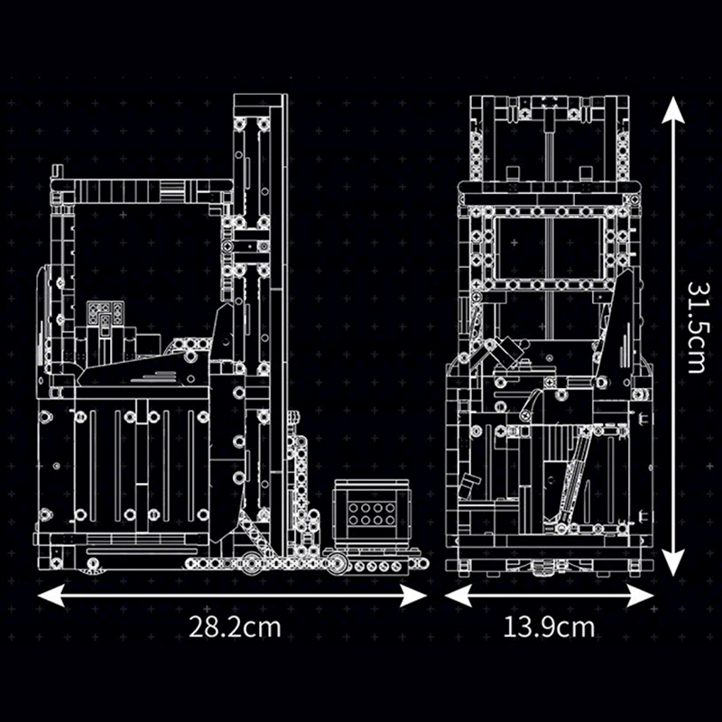 Rear wheel drive and rear wheel steering provide authentic forklift manoeuvrability, allowing tight turns and precise positioning just like a real industrial vehicle. Whether you’re stacking loads, demonstrating lift mechanics, or displaying it as a centrepiece, the functionality transforms this build from static model into a fully operational machine.