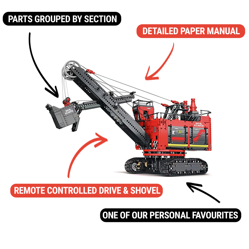 Constructed from nearly 3000 precision pieces and stretching over 60cm in length, this remote-controlled giant is fully equipped for realistic operation. With remote-controlled drive, crawler movement, full 360-degree superstructure rotation, boom articulation, and a fully operational opening bucket, every core function of a real rope shovel is faithfully recreated.