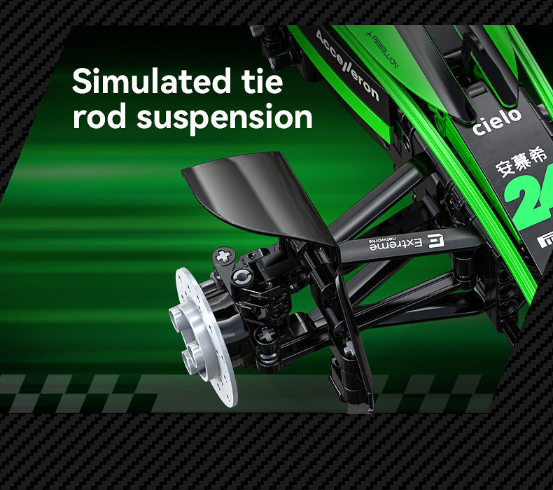 Beneath the detachable engine cover sits one of the most detailed V6 engine assemblies available at this scale, complete with rotating pistons, intake system detailing, and refined metallic accents. Independent front and rear suspension replicate advanced race chassis geometry, while a functioning steering wheel connects directly to the front wheels for authentic mechanical feedback.